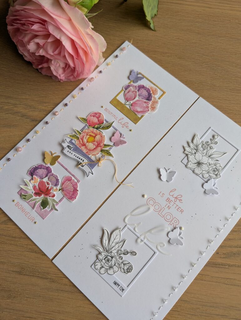 Le deuxième défi était celui de Sonia, où il fallait faire 2 pages : une page tout en couleur avec 1 seul élément en noir et blanc, et une page en noir et blanc avec un seul élément en couleur :